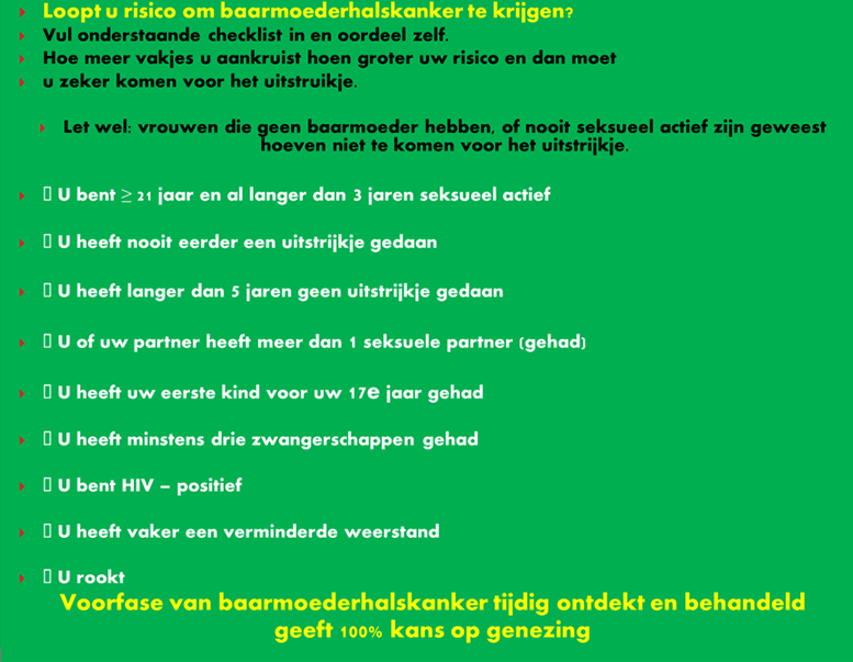 - Voorfase van baarmoederhalskanker tijdig ontdekt en behandelt, geeft kans op 100% genezing.
